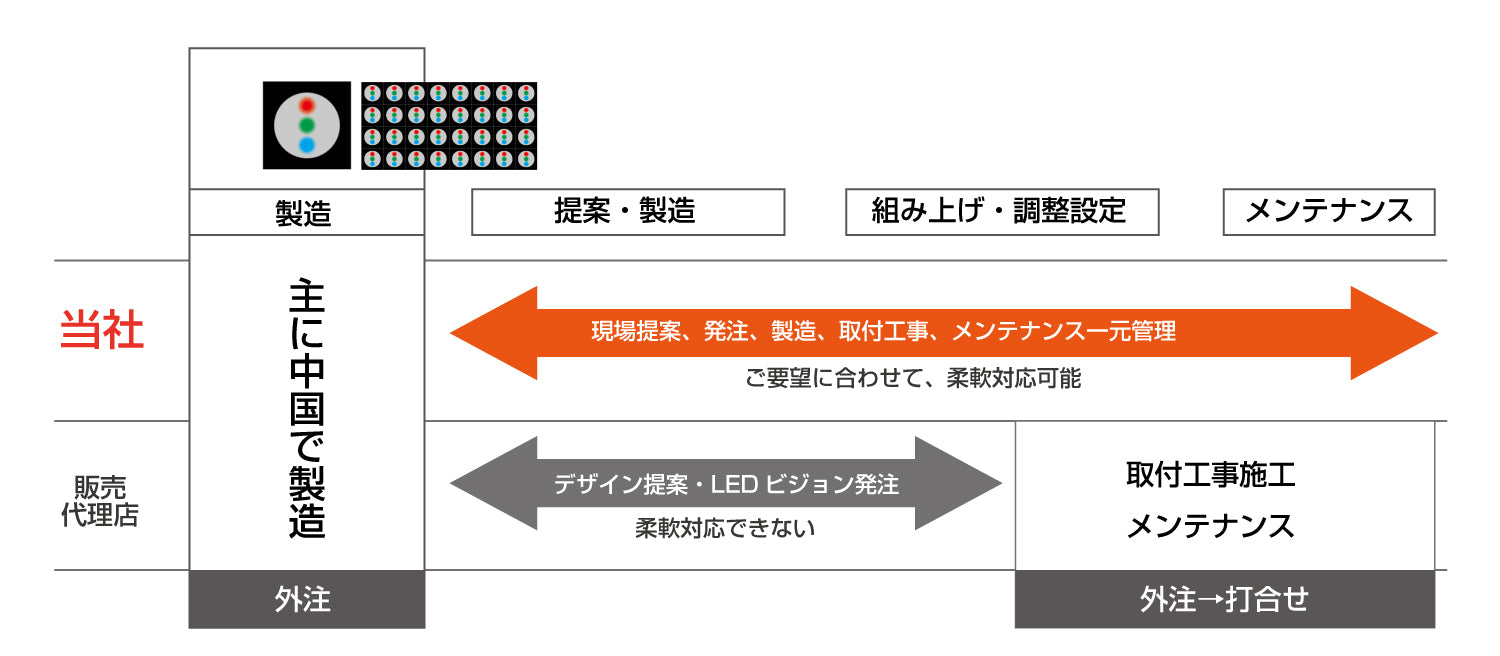LEDビジョンは、高輝度とフレキシブルなサイズ・レイアウト、環境に左右されない特性を持ち、消費電力も少ないのが特徴です。弊社は現場部材交換・LEDビジョン取付点検修理するまでトータルでサポートいたします。